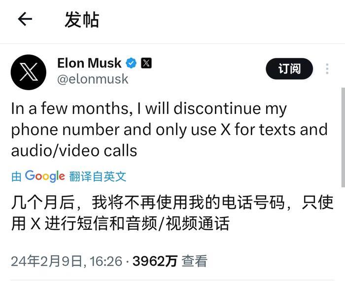 所以,马斯克告诉自己的1.7亿个粉丝账号:“在几个月后,我将停止使用我的电话号码,只使用X平台发短信和进行音频/视频通话。”