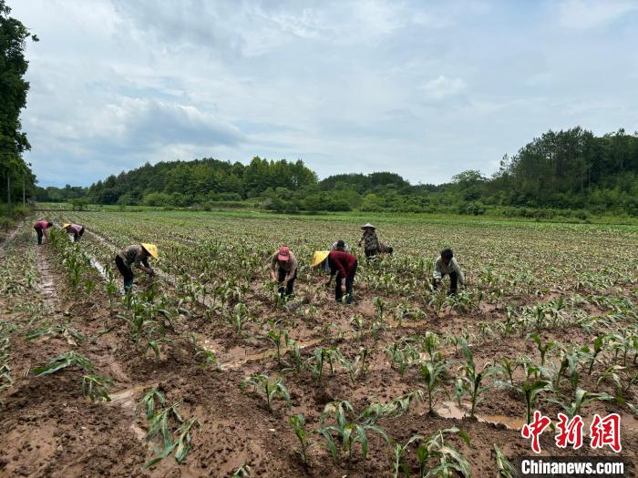 6月21日,黄山屯溪区奕棋镇江村丰弘农业科技公司组织人员对受灾倒伏的玉米进行扶直工作。中新社记者赵强摄