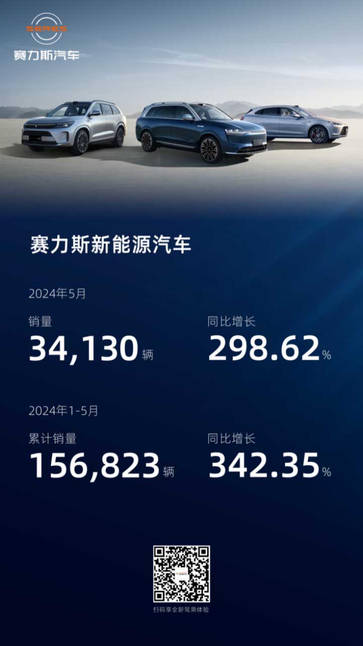 6月2日,赛力斯发布5月产销快报。数据显示,赛力斯新能源汽车5月销量达34,130辆,同比增长298.62%;今年1-5月,赛力斯新能源汽车累计销量156,823辆,同比增长342.35%。