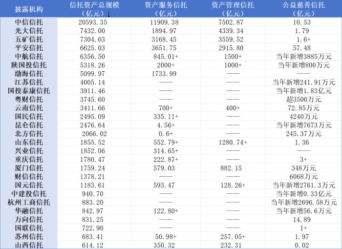 与之对比,中信信托、光大信托、平安信托和五矿信托则大方展示了公司资产服务信托、资产管理信托和公益慈善信托三项业务当年累计数据。